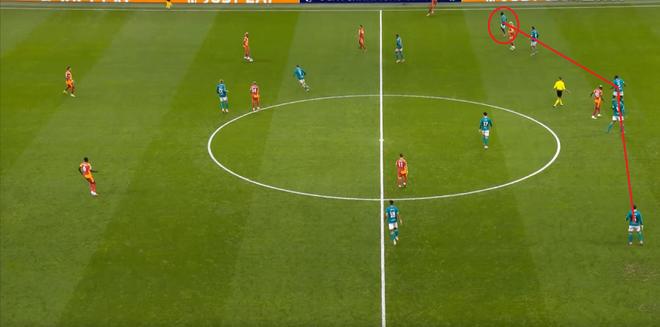 尤其是第25分钟这次,埃基蒂克在接到维尔茨传球时出现失误,结果被加拉塔萨雷穿越中场,完成由左至右的横移线路,让奥西门获得了射门的机会: