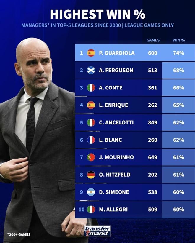 近日,瓜迪奥拉在执教顶级五大联赛比赛中达到了600场里程碑——下面是达成这一里程碑的教练胜率排行榜,展示谁在这些“至少 200 场”高强度联赛中效率最高。