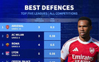 五大联赛球队各项赛事场均丢球榜:枪手0.3球最少,米兰第二